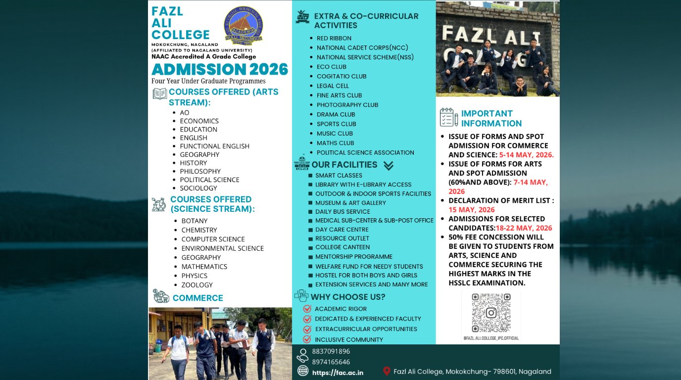 Fazl Ali College established on 8th September 1959, has emerged as one of the leading educational institutions of the State. It is a co-educational Government College affiliated to Nagaland University. It takes pride in being the oldest College in Nagaland. Located amidst beautiful natural surroundings the College is about 5 kilometres from Mokokchung town.