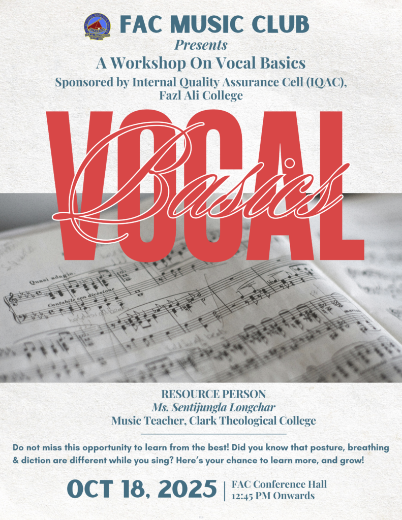 The FAC Music Club organized a One-Day Workshop on Vocal Basics on the 18th of October, 2025 in the Conference Hall. The event was sponsored by the Internal Quality Assurance Cell (IQAC) Fazl Ali College. The resource person for the event was Ms. Sentijungla Longchar, Music Teacher, Clark Theological College.